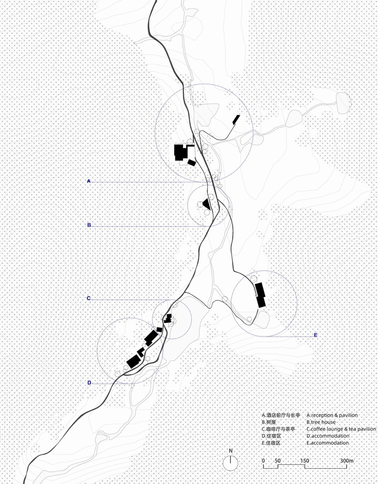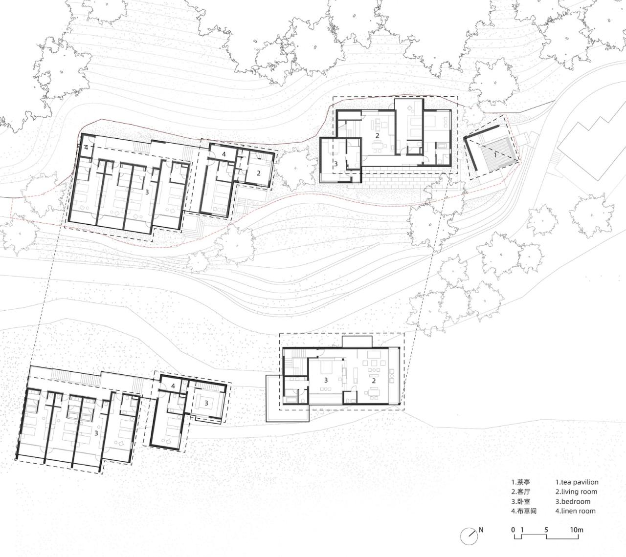 民宿提供的价值始于居住,成于场地、环境、服务给人的全方位体验,设计师在人身体的行径中,塑造房子与房子、房子与树之间的对偶关系,营造出六块场地既相互独立又环环相扣的场景。