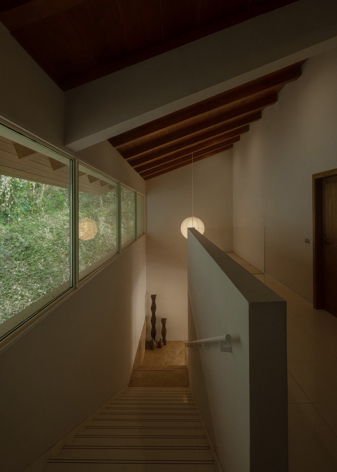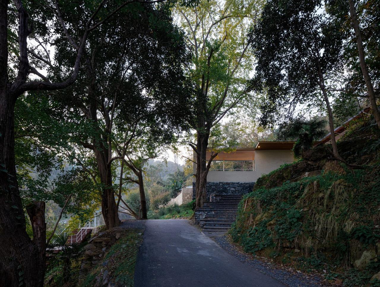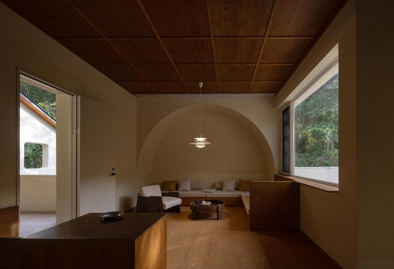 开放的景观茶亭以暗色调的木结构、烧杉木瓦和本地毛石构筑,隐身在两个白房子—— 咖啡厅和客房之间。