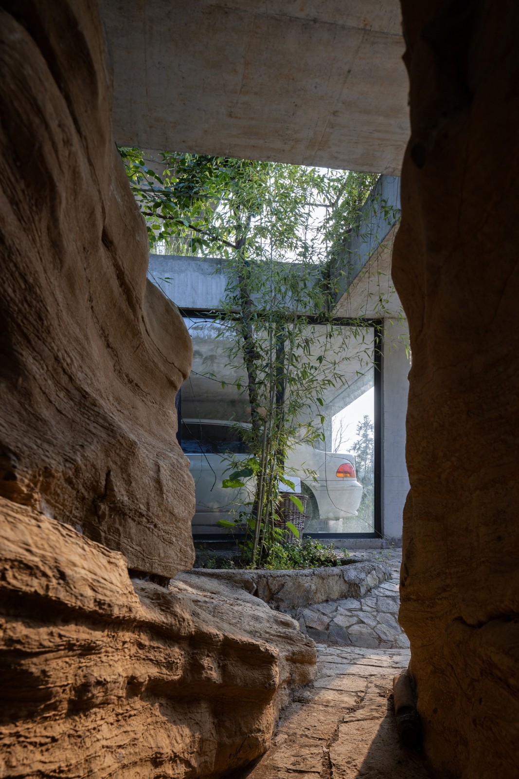 基地裸露的岩石足够作为持力层,纳入房屋结构体系的一部分。但其高低错落形状各异,放线后结构柱部分落于石上,而局部落在夹缝里。为了尽量减少基础开挖对石缝空间的影响,同时减少雨季对于基础结构的侧推力,部分承重构件通过抬梁转换。建筑主体部分全部采用剪力墙结构,利于室内空间的完整。非承重部分同样现浇,但配筋量减少。入口处设置的钢柱,作为异质存在,意在强化其公共性。原石花园区域的楼板,靠四根形态各异的混凝土柱体支撑,与包浆的原石形成对照。