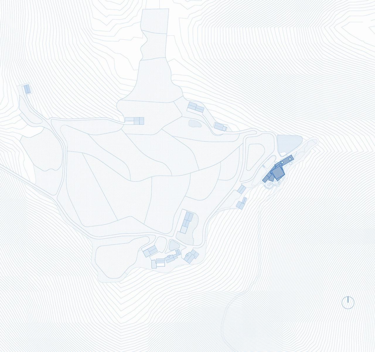 建筑采用混凝土现浇,一层局部以石为柱,顶板覆土插入山体之中,取得与自然一体的使用空间,同时削弱建筑的体量感。混凝土墙体作为自然的背景,其旋转产生的或虚或实的空间,用爬藤覆盖,在半山之中若隐若现。非重叠部分的上层采用上翻梁的做法,使结构体系看起来层层脱开,呈现出石块般的自然堆叠感。