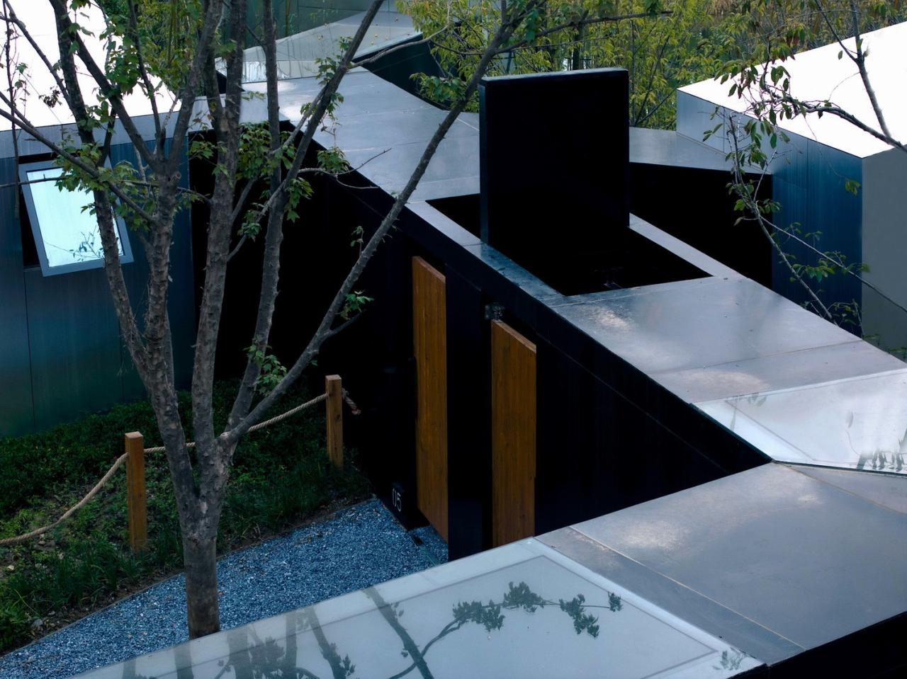 于是设计转化成了“找房子”的游戏,13个分别是卧室、起居室、卫生间的模块散落在小岛上,通过100米长,80厘米宽的黑色廊道连接。廊道时而是迷你院子,时而在室内天光大开,结合小岛地形的不规则角度,连接了全部的房间,也为居住空间提供了建立私密性的遮挡。