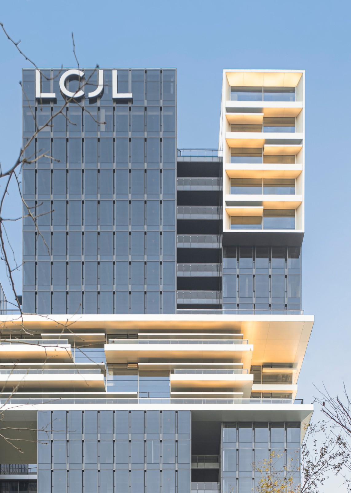 塔楼以相同的“L”形体块、相似的体量及立面幕墙形式,使两个独立塔楼形成视觉上的整体性。又根据场地条件及企业气质、诉求,进行了更精准的空间与形式设计。