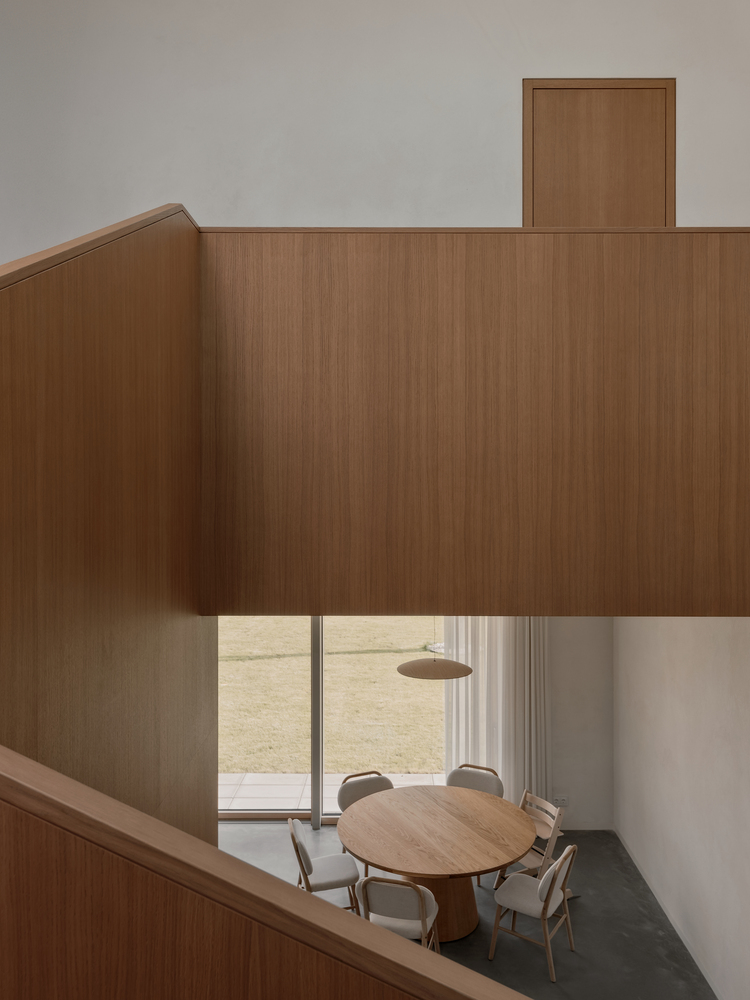 我们认为,入口在建筑体验中始终扮演着至关重要的角色。无论是开车还是步行,住户都会经过车库和房屋之间的连接屋顶下的空间。他们会看到一扇大窗户,然后通过外墙木板包覆的定制门进入住宅。最后的点睛之笔是一个微小的细节:一块弧形钢板突出了门把手。