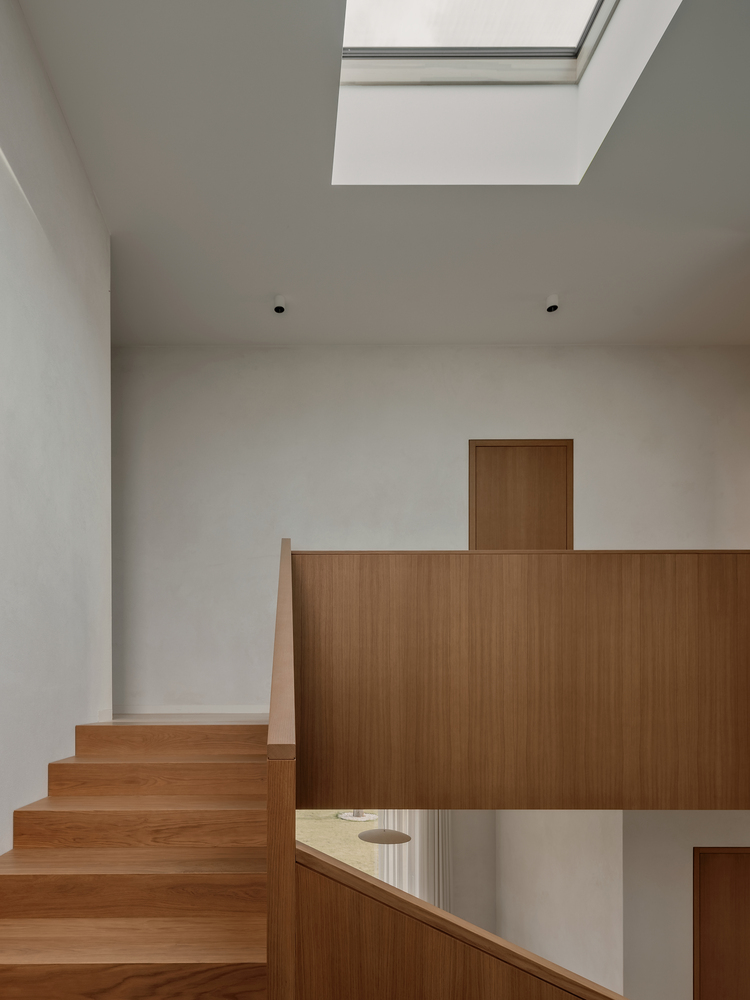 楼梯成为中心特色–木质结构连接两层楼,并配有实木贴面扶手和台阶。双层挑高空间的顶端是一扇天窗,让光线流向一楼。