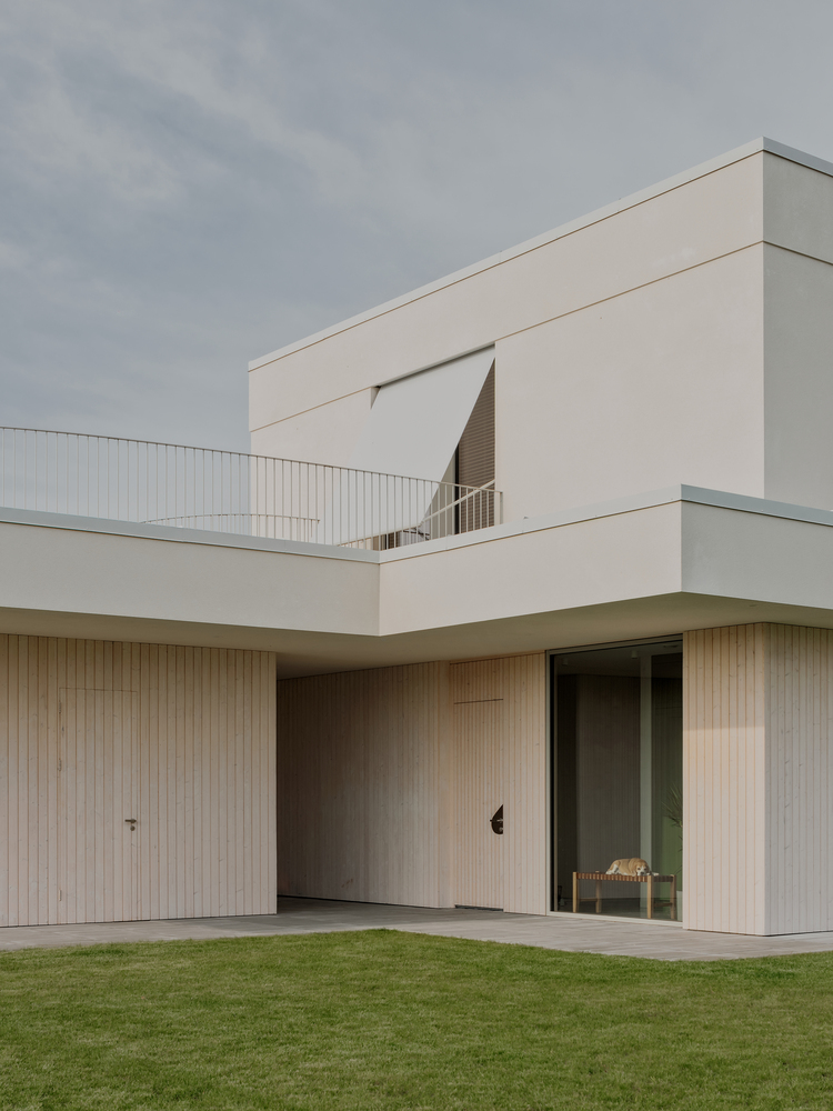 在桦树林立的花园中,坐落着一座简洁的线性建筑,窗户采用对称的韵律和立方体结构。坚固而简洁的悬挑屋顶将车库、住宅和花园露台融为一体。底层外墙采用木质覆层,上层采用石灰抹灰。弧形屋顶露台和扶手略微引入了轻松的休息形式。