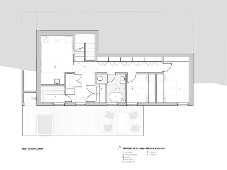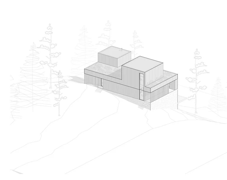 建造 Tsuga 住宅是一项技术壮举,由建筑商巧妙地执行完成。要在陡峭的山坡上固定建筑结构,这一挑战需要精心的规划以及精确安排施工阶段的顺序,并采用创新的解决方案,以确保建筑的长期稳定性和耐久性。建筑师们特别关注水和土壤的管理,以保障住宅的结构完整性。平屋顶的雨水被引入干井中,施工结束后,场地被恢复到自然状态。本地植被被重新种植,以稳定土壤并防止水土流失,同时保持景观的原始轮廓。