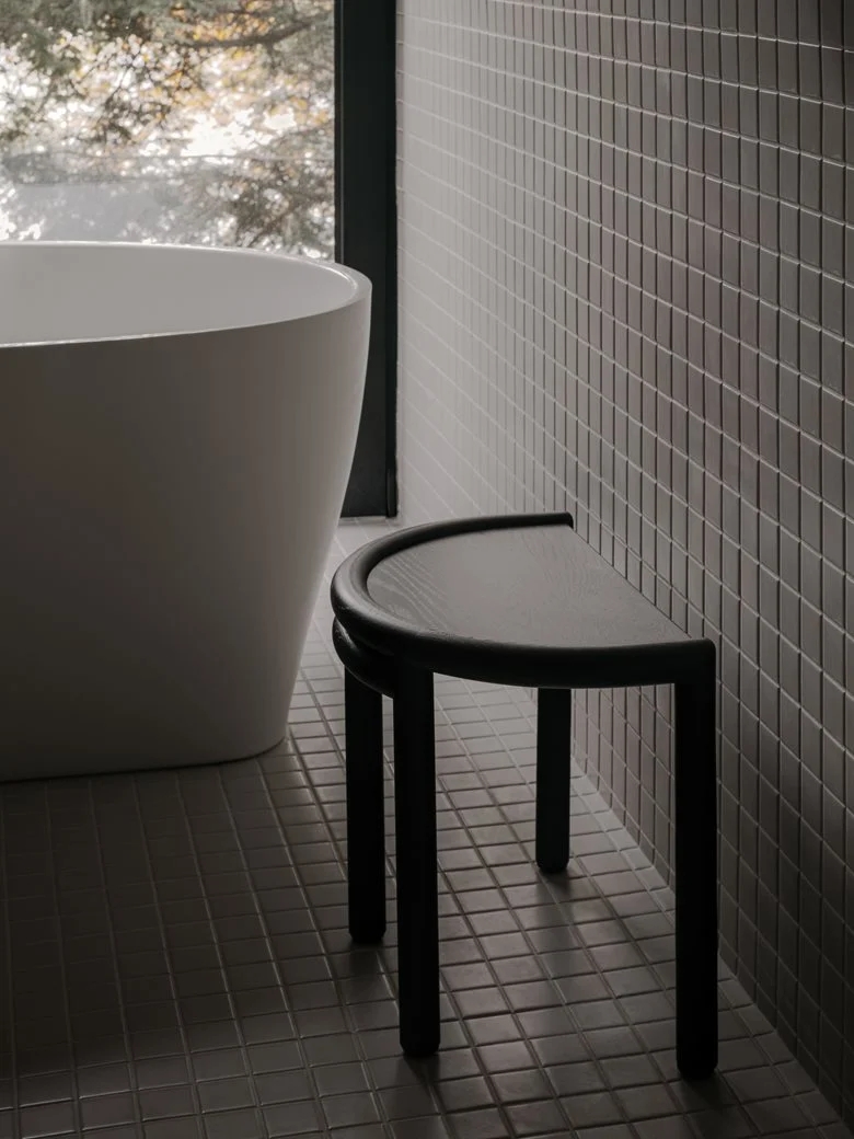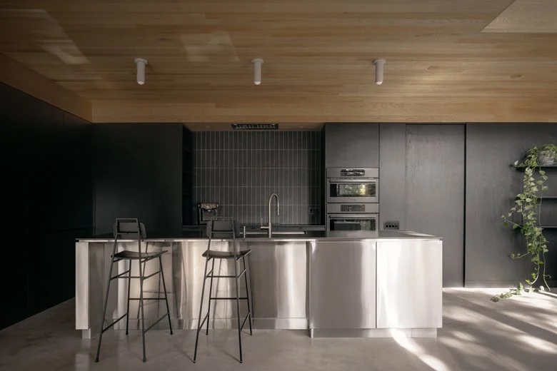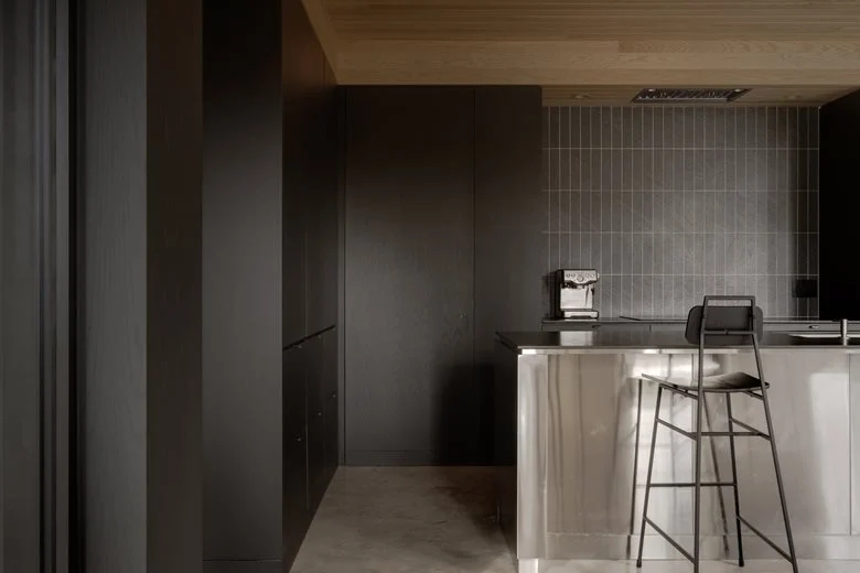 家具和材料的选择体现了对品质和工艺的追求。在厨房,北墙和西墙完全覆盖着黑梣木 —— 这一大胆的选择不仅统一了空间,还巧妙地隐藏了储物空间。一个中央不锈钢岛台、瓷质台面以及精心挑选的设计单品,共同营造出一种简约而优雅的氛围。尽管住宅占地面积紧凑,但却提供了出色的灵活性。主楼层的一间卧室考虑到了多代同堂居住或未来变化的需求。一个带纱窗的露台扩展了户外生活空间,打造出一个宁静、隐蔽的休闲场所。与此同时,花园层的桑拿房提供了一个可以冥想的空间,还能欣赏到湖泊的绝美景色。一座雕塑般的楼梯是住宅的标志性特征,开放式的楼梯平台让自然光线能够透进来,突显了住宅的垂直感。其简约的设计,搭配红橡木房门,进一步增强了住宅的温暖氛围。