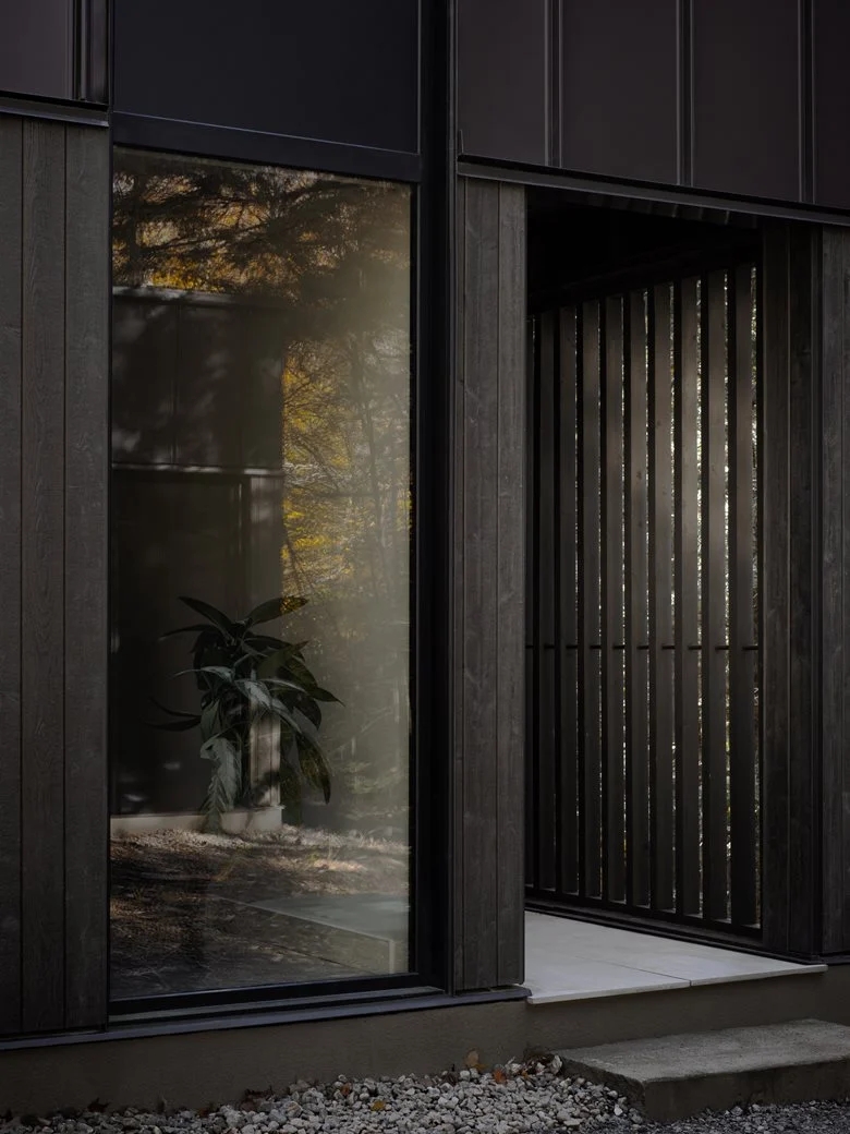 木材作为主要材料,均来自当地,体现了环保意识。建筑外部体量的上部覆盖着金属,以增强建筑围护结构的耐久性。大面积的玻璃体现了亲生物的设计理念,模糊了室内外的界限,让森林的气息渗透到住宅的核心区域。