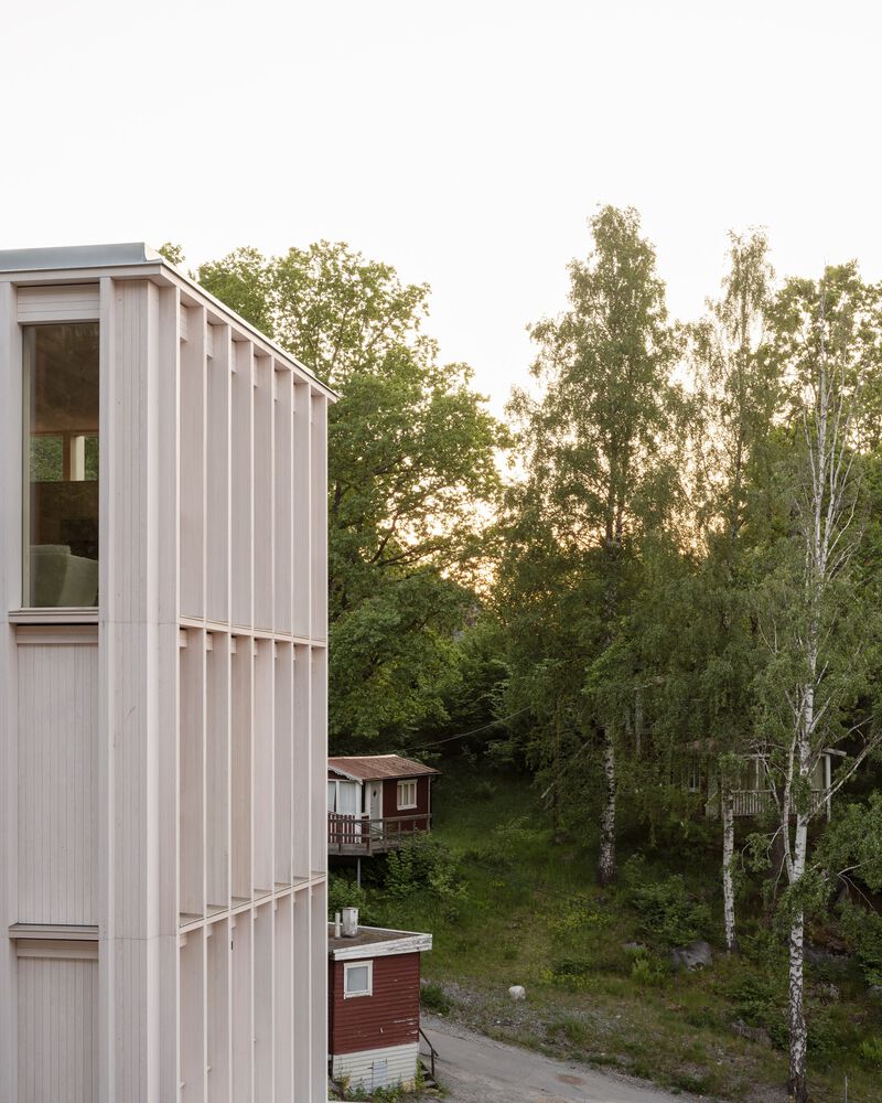 这处木质度假别墅设计位于风景如画的斯库鲁松德海峡(Skurusundet strait)西北侧,对于那些想要在此建造新房的潜在买家来说,面临着诸多挑战。该地块是一个深邃的峡谷,东西两侧被悬崖环绕,道路通行不便。虽然地块上高耸的峭壁能让人欣赏到斯德哥尔摩港口入口的壮丽景色,但要在遵守规划法规且控制合理建筑成本的前提下,到达这些高处进行建设,似乎是一项艰巨的任务。