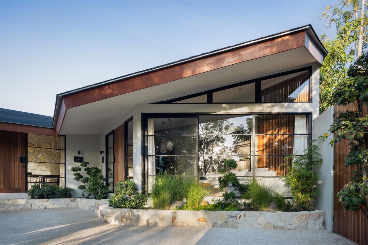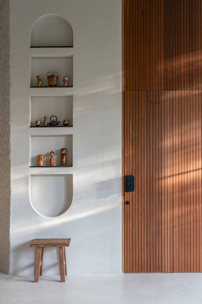 别墅精心设计了实体与空间之间的相互关系,以最大限度地引入光线、实现通风,并框选出繁茂周边环境的美丽景致。室内空间流畅地与精心布置的日式花园相连,模糊了室内外的界限。独特的对角线布局不仅提升了空间体验,还加强了别墅与自然的联系,让周围的绿植成为日常生活中不可或缺的一部分。