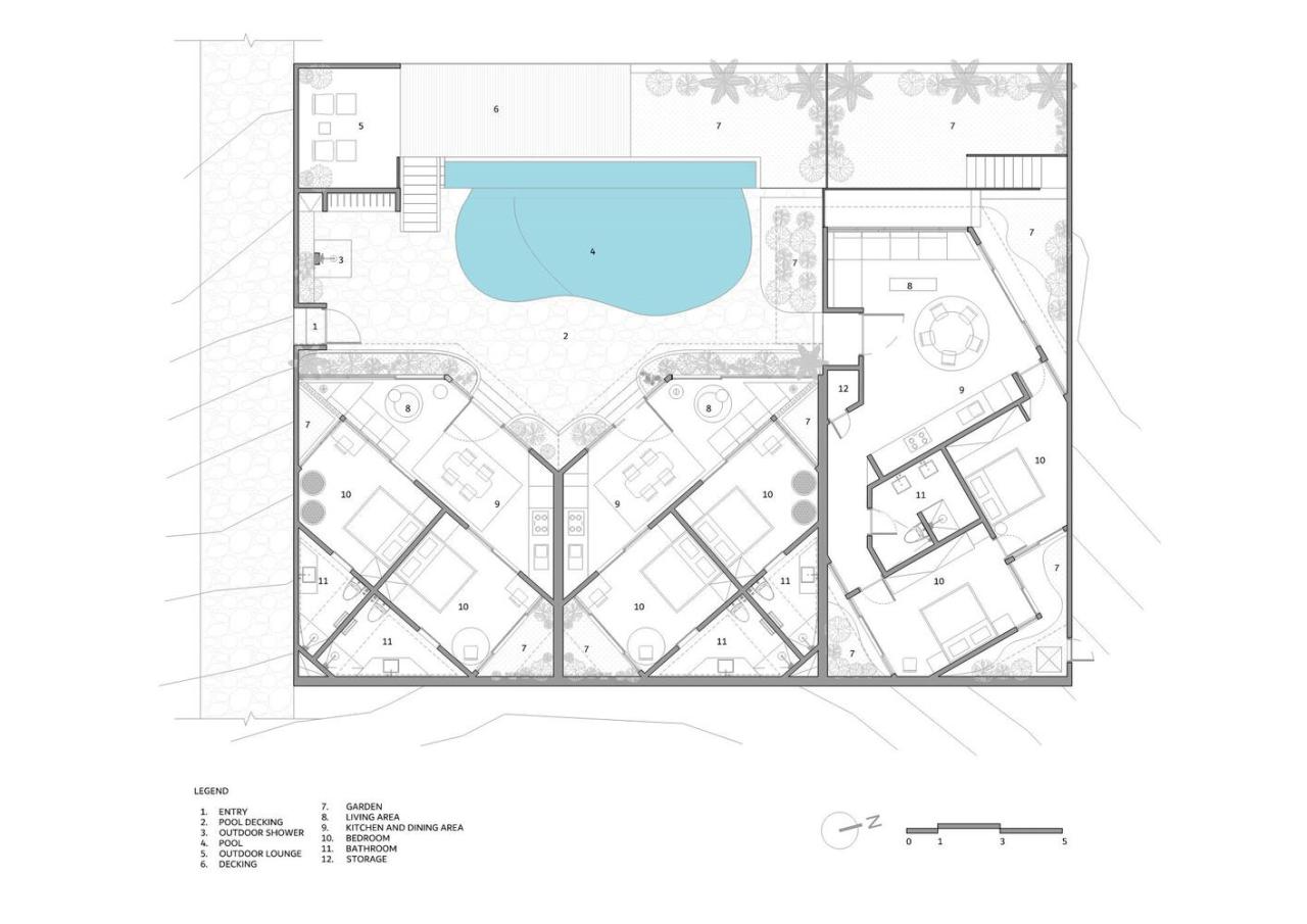 别墅的布局经过精心设计,十分紧凑。它的一大显著特点是设有三个入口 —— 分别位于左侧、中间和右侧,确保人们能顺畅通行,同时又不会影响每位居住者的隐私。这种巧妙的设计让居住者能够自然流畅地在空间内活动。别墅内有两间卧室,每间卧室都配有独立卫生间,此外还有一个舒适的客厅和一间雅致的餐厅。