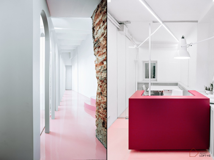 窗台与笼子形状的构件相连,桌子腿也设计成笼子形状。室内全部使用白色粉刷,只有地板使用了醒目的粉色,我们决定保留一些老建筑的原有墙体,这样能带来一种时间的厚重感。尤其将未经粉刷的老墙体与透明材质的玻璃结合使用,使两种来自不同时代的材质在这里相遇融合,能够创造出博物馆一般的历史氛围。
