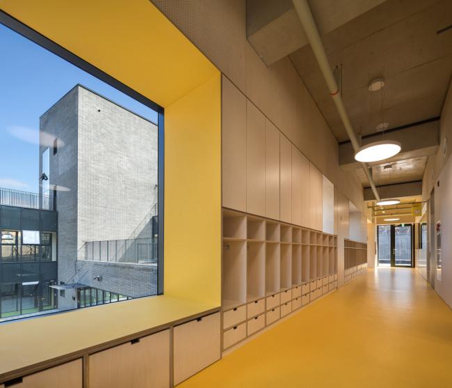 建筑根据自然渐变的场地地形被分成三层:最底层为停车场和后勤服务设施;上面两层为幼儿园功能用房。学校通过对所有停车位和公交车转弯的控制来为孩子们提供安全的生活环境。在规划期间以有效的方式利用斜坡场地可以使地下空间获得与一层内同等条件的自然光照射量。除了顶层之外,所有楼层都与地面直接联系,这意味着几乎每个幼儿园教室都有前院。300名学生被分散在三个不同的建筑单元内,彼此通过地下的台基相连。