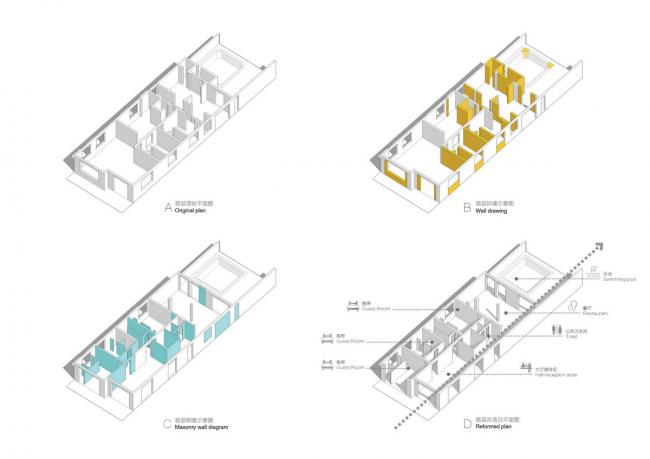 原建筑为当地人一家四口居住,因其对于居住条件要求不高,室内空间分区随意且不合理:建筑西北面开窗巨大,一来正对后海村街道非常嘈杂,二来下午西晒严重;建筑东南面正对沙滩,开窗太小,影响室内采光和视线;一层沿海平台原有通往二层的室外楼梯严重影响采光,并造成一层室外空间的流线混乱;建筑一层空间拥堵,没有设置开敞的公共空间;不适合酒店的功能需求。