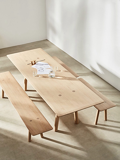 还有一组长方形长凳,它们具有极简的设计和可见的关节,如餐桌一样。