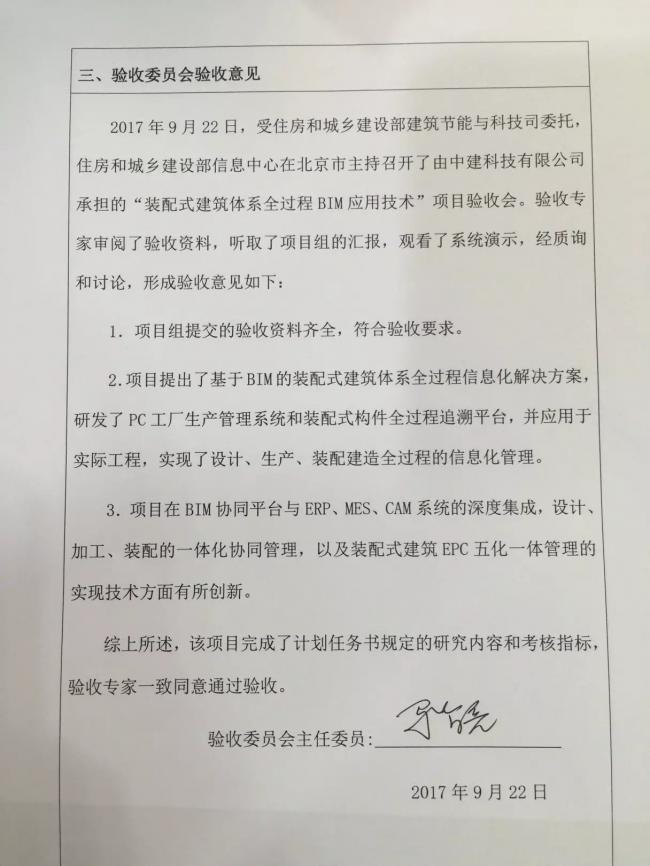 专家组认为,本课题提出了基于BIM的装配式建筑体系全过程信息化解决方案,研发了PC工厂生产管理系统和装配式建筑构件全过程追溯平台并应用于实际工程,实现了设计、生产、装配建造全过程的信息化管理,项目在BIM协同平台与ERP、MES、CAM系统的深度集成,设计加工、装配的一体化协同管理,以及装配式EPC五化一体管理的实现技术方面有所创新。