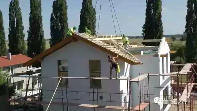 屋顶就可以开始安装了,装配式建筑屋顶与墙体和楼面板一样,分分钟搞定。