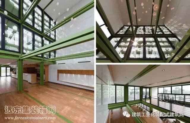 由于气候条件的影响,集装箱建筑需满足防渗、防漏、保温、隔热等各项要求,为了保证集装箱的纯净外表,设计中发展了大量的特殊节点。这些精巧的节点与相对粗犷的集装箱构件形成了鲜明的对照,比如在室内可看到的集装箱框架组合梁。此外,由于集装箱不规则的布置方式,其模数化的系统甚至受到了一定的挑战。