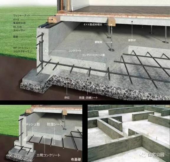日本自建房对基础要求很是精细,先平整场地开挖沟槽,接着在基础地面铺设一层碎石垫层,现浇素混凝土进行养护,待硬化完成后铺设一层防水薄膜。开始进行地下架空层的处理,安装模板绑扎钢筋浇筑混凝土!