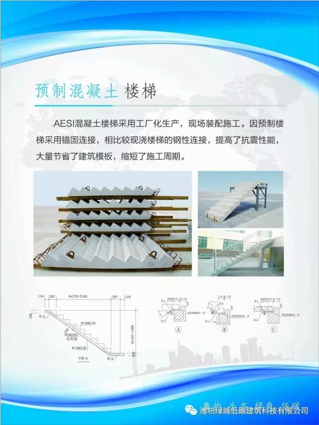AESI预制构件包括:AESI预制混凝土外墙板、AESI预制混凝土内墙板、AESI预制混凝土叠合板、AESI预制混凝土楼梯,这些构件又分为标准板和异形板,都是在工厂中生产的,标准化、多样化、信息化程度高。