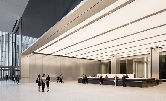 世界贸易中心3号楼的大堂主要色调为白色,灰色,黑色,包括一个圆滑的玛瑙前台,花岗岩地板和墙壁,乍一看似乎是金属拉丝。相反,他们是织物层压玻璃。头顶上是一个(BIM建筑)42英尺高的照明吊顶PVC天花板。