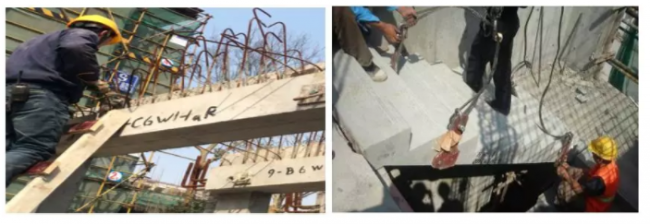 楼梯安装顺序:剪力墙、休息平台浇筑→楼梯吊装→锚固灌浆