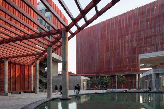 该事务所想要为学生创造一种特殊的场所感,不论是个人角度还是放大到社区层面,都让他们紧密的生活在一起。建筑上使用了玻璃钢筋混凝土材料进行施工。这种材料在当地生产制造,能将旁遮普的赭红色转换成工艺精制的红色玻璃钢筋混凝土幕墙,这种幕墙能让阳光穿过照射在阳台上,让公共空间中的人清晰地看到巨大的混凝土结构,为日常生活创建了一种强烈的背景韵律感和肌理感。