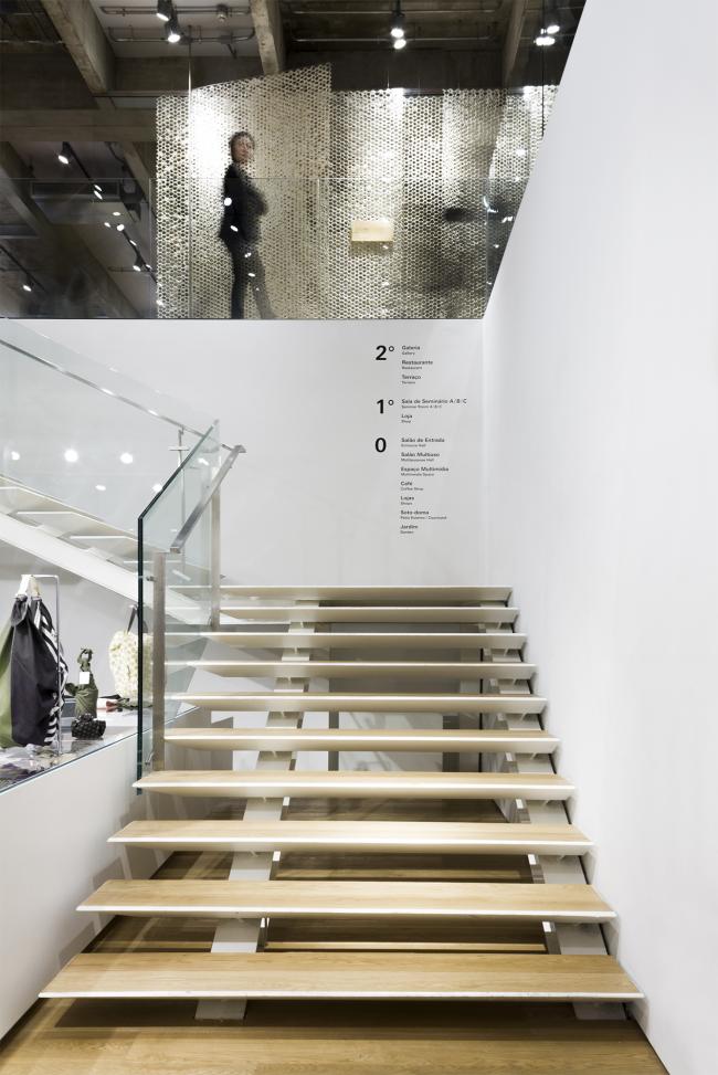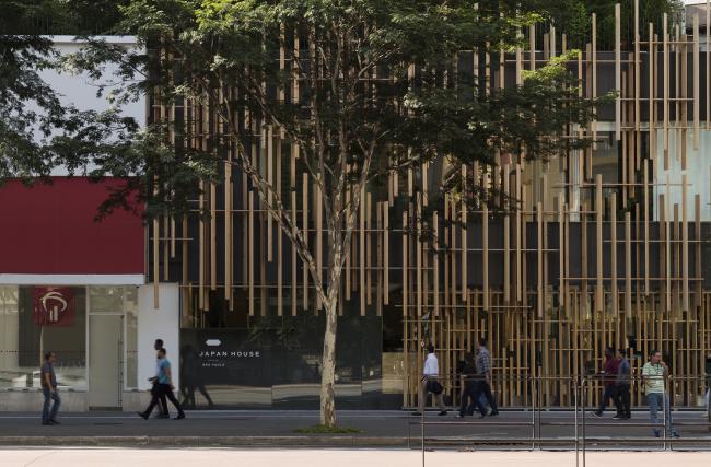 该设计最具代表性的一面是立面,它呈现出“由 hinoki 制成的木质规则幕布,日本工匠与传统的 cobogos (巴西现代建筑中常用的空心水泥块)进行对话”。