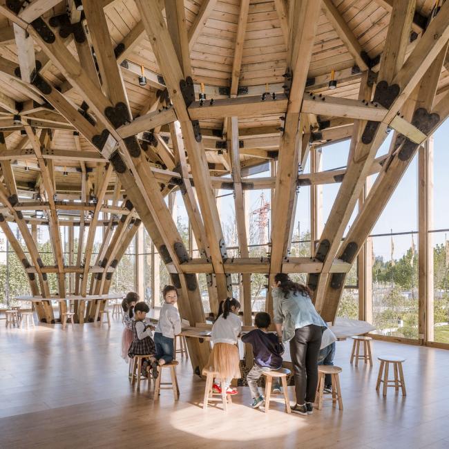 本项目附属物的营造方式,就是遵循生命体的构建智慧。如家具,就采用了从结构体自然生长而成的方式,桌子与“集束柱”各单体木柱组接,家具“长”在结构柱上,所有的围护栏杆也是长在结构体系上。可以这么说,最核心的结构树,就自然生长出了家具、护栏,甚至向外生长织出外表皮,同时这些必须的“零部件”因为是主结构体伴生的关系,也会反作用于结构体而协同受力使得结构更稳定。