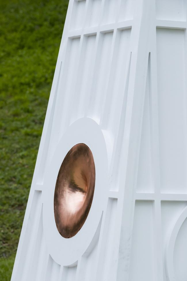 由 Lucy 和Jorge Orta设计的五边形钢结构使用现代材料还原 Rotundo 圆厅的形式,那是“早前在场地内发现的一种传统的爱奥尼小品”。原来的作品通常创造透视错觉,这个同样命名的作品镜像了水上花园的球形传统视角,并将附近的八角塔呈现在倒影中。