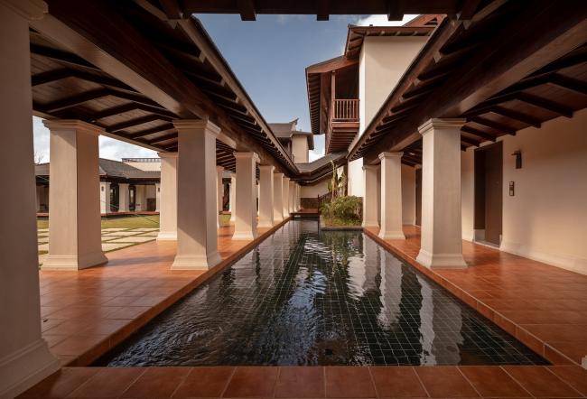 酒店以历史为背景,嫁接海上丝绸之路沿线四种不同但经典的文化元素,将江南园林崇尚自然的哲学思想,东南亚讲究慵懒平衡的美学特质,地中海简单圆润的自然气息,与伊斯兰独有的沉静内敛,分别呈现于四处院落,互为对话。院落中各自庭院之间有一定距离,差异但并不突兀,富有空间张力,可以看出随着地域的流转而更迭的文化风貌。