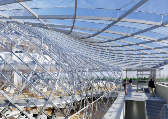 二层以上用于合作办公的空间在现有结构与新“蚕茧”形体间交替。从六楼往上,一系列包含厨房花园、屋顶平台以及餐厅的空间提供了环视整个城市的景观。