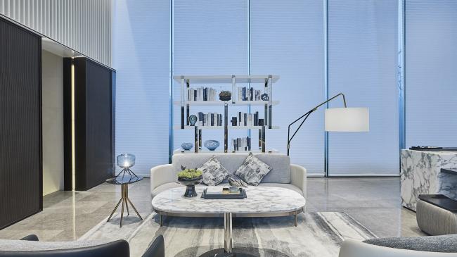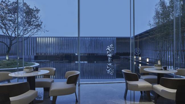 一树、一石,池面如镜。整个庭院在纯粹的线条和层次分明的结构下显得悠然自已,充满禅意的当代极简审美融合进西湖的山色湖光中,宁静而雅趣。镜面水池,以黑金石地砖为材,将空间建构出一种平和的境界,边上的西湖五景,营造出一步一景的视觉体验。与百年树龄的紫微树交相辉映的,是以镜面不锈钢为材质制作的五云山奇石雕塑,背后是玻璃格栅排列而成的亭云画壁,东方语境下的当代呈现。庭院最映入眼帘的是超巨幕弧形玻璃墙,也是生活馆与庭院足以相隔而望的方式。