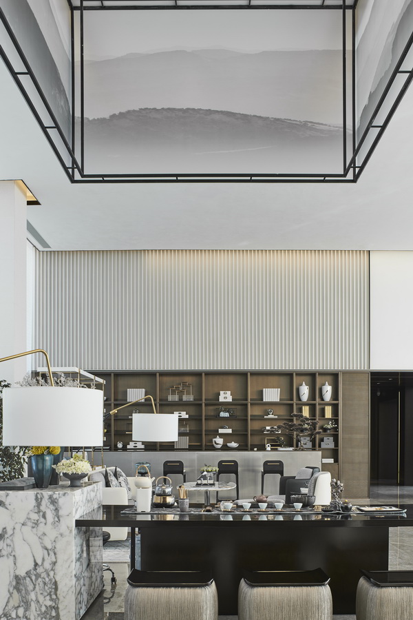高级灰承接着传统与当代的共融,白与金穿插其间,相互映衬,而空间沉稳内敛的品质则归功于清晰的纹理和层次,颇有画龙点睛的意味。为了舒适的氛围和庭院山石意向,天顶悬挂的四方形水墨屏风,递进了空间的艺术境界,呈现着中国画中留白的韵味。水墨纹大理石茶几和方桌,以及纹路相近的摆件,也呼应了宜山宜水的情趣。