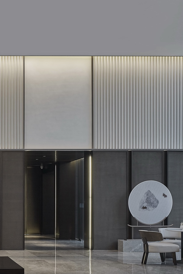 深色木质格栅与大块面的金、银、灰三色搭配,地面依旧是灰色大理石,空间平和且内敛。几何线条的匠心排列,新中式器物适度融合,充满了当代审美的东方韵味。沙盘在此其间,优雅从容。