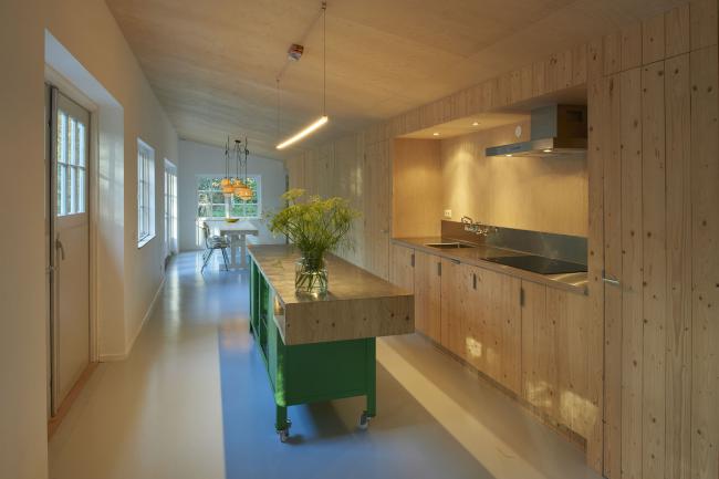 这一决定最终导向了一个明确的解决方案;沿长度将这一瘦长的建筑划分为两个部分。起居区域采用经典布局,分为三个部分:厨房,餐桌和休憩区域。但是在这里,布局开放且瘦长,厨房位于中间,两侧为另外两个区域。因此厨房被布置在正中,位于原本两个老房子中间车库的位置。当夏季在室外用餐时,平面布局会变得更好,因为餐桌到时可以放置在室外正对厨房的位置。