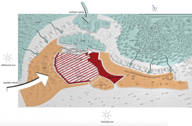 这些技术不仅为该地区的美丽景观创造了条件,而且也为重要的环境收益创造了条件:设计中保留了当地的生物多样性和景观历史,减少了用水、农药和化学品的需求,并重新利用挖掘出来的土来形成墙壁、路面,卵石铺面可以保护植物的根部,覆土上栽种植物减少了建筑的碳排放量,同时将新度假村与周围景观的材料和氛围结合起来。