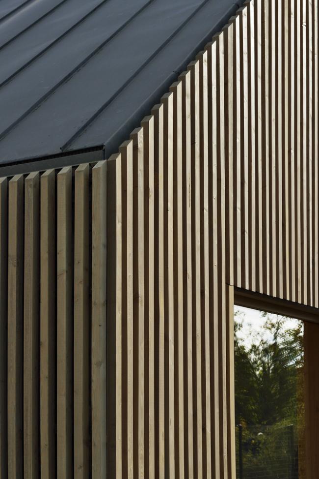 整个项目在施工过程中有意识地减少了一些不必要的步骤,使得整个学校在十个月的时间里快速建成。该项目所在的城市是区域自然公园的一部分,这个公园将会引领着整个学校以高环保性能为目标完成。建筑体量的框架结构和外立面均采用木材,其线性布局创造了一个宽敞的区域,能够有效激励人们延续在旁边购物中心和幼儿园中步行的意识和行为。